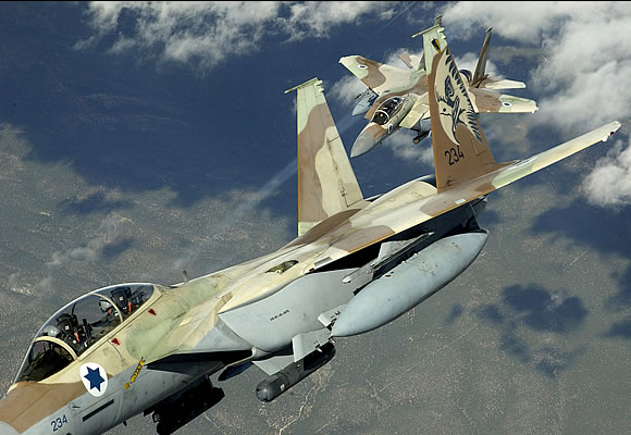 Two Israeli F-15's fly over the Nevada Test and Training Ranges during a Red Flag 04-3 training mission at Nellis Air Force Base, Nev., Aug. 25, 2004. Red Flag is a combat training exercise involving all branches of the U.S. military, as well as coalition forces from Belgium, Denmark, the Netherlands, Norway, United Kingdom, Israel, Singapore and NATO. DoD photo by Tech. Sgt. Kevin Gruenwald, U.S. Air Force.