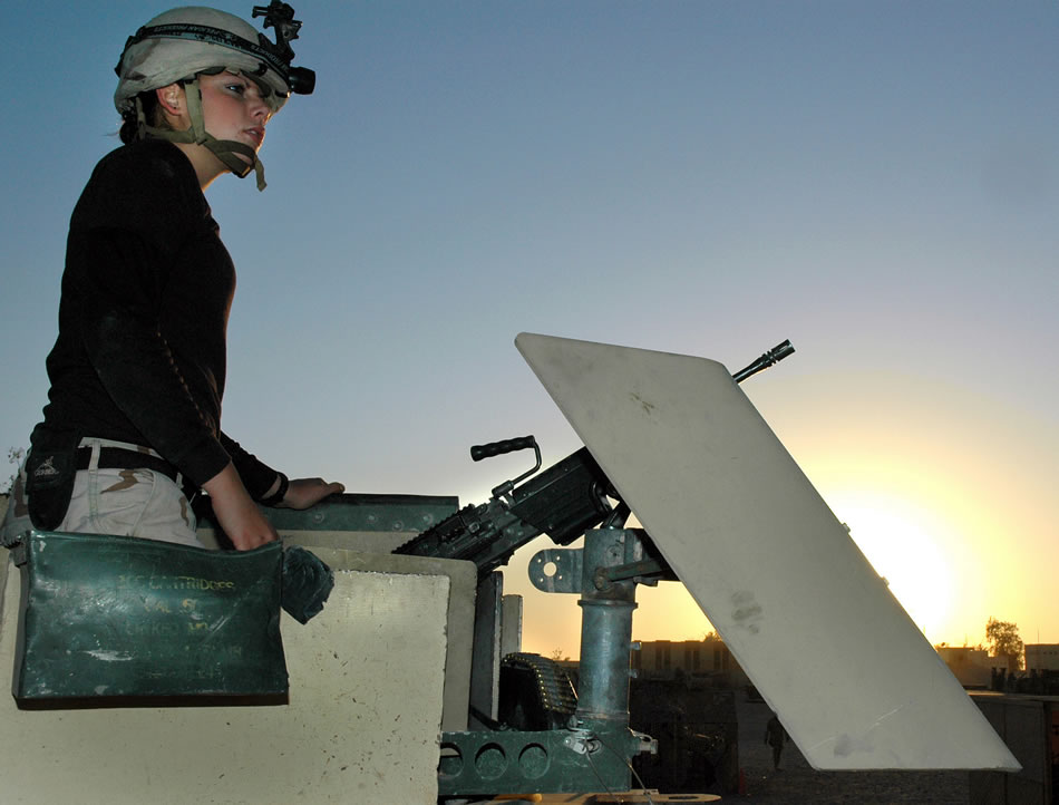 TIKRIT, Iraq (AFPN) -- Airman Catherine Karl prepares for a night convoy from base Speicher. Airmen with the 732nd Expeditionary Logistics Readiness Squadron here provide armed escort of combat patrols to ensure passengers and cargo reach their destinations throughout Iraq. Airman Karl deployed from Royal Air Force Mildenhall, England. (U.S. Air Force photo by Maj. Robert Couse-Baker)