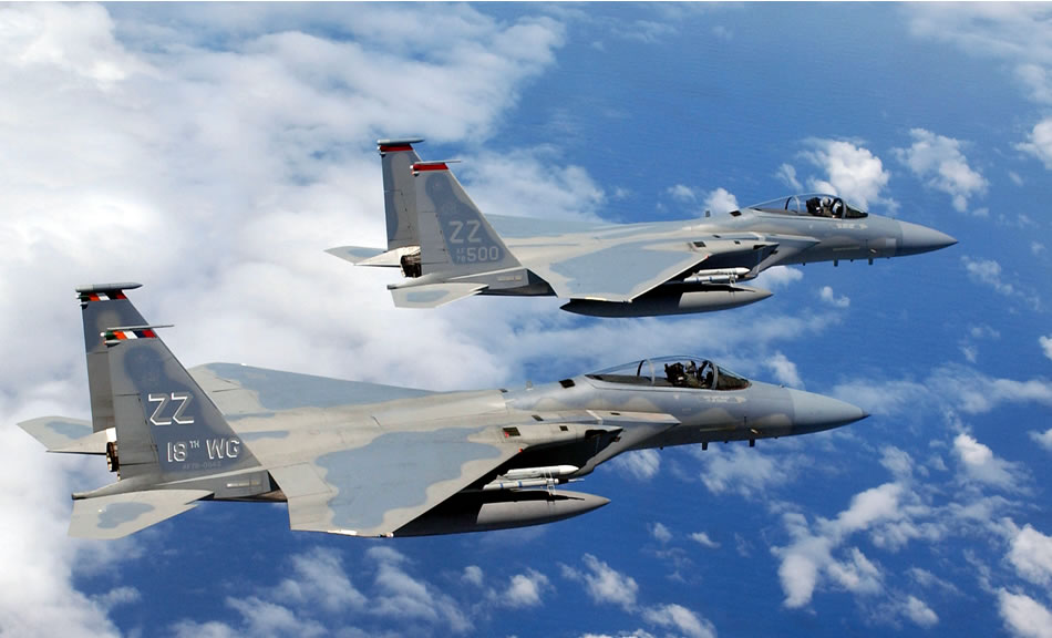 OVER JAPAN -- A formation of F-15 Eagles flies over Okinawa following a joint bilateral training mission here recently. The Japanese-American mission tests the air defense and counter air capabilities of both countries. The aircraft are assigned to the 67th Fighter Squadron at Kadena Air Base. (U.S. Air Force photo by Tech. Sgt. Richard Freeland)