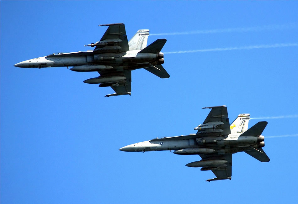 Persian Gulf (Dec. 30, 2005) - A pair of F/A-18 Hornets assigned to the "Valions" of Strike Fighter Squadron One Five (VFA-15) pass over the Nimitz-class aircraft carrier USS Theodore Roosevelt (CVN 71) while preparing for an arrested landing aboard ship. Roosevelt and her embarked Carrier Air Wing Eight (CVW-8) are underway during a regularly scheduled deployment, providing close-air support to coalition troops in contact with anti-Iraqi forces, and maritime security operations. U.S. Navy photo by Photographer's Mate Airman Apprentice Nathan